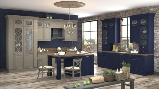 Особенности модели: высокие шкафы, изящные витражи с тонким переплетом, карниз, колонны, колонны декорированы объемными вставками, МДФ с объемной филенкой и покрашены эмалью, остров с массивными колоннами, рамка с переплетом