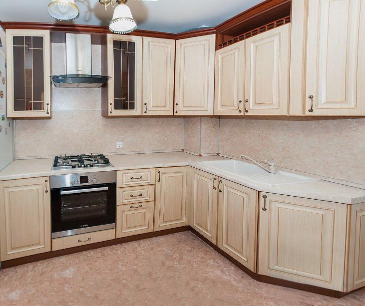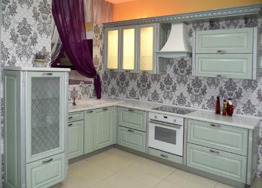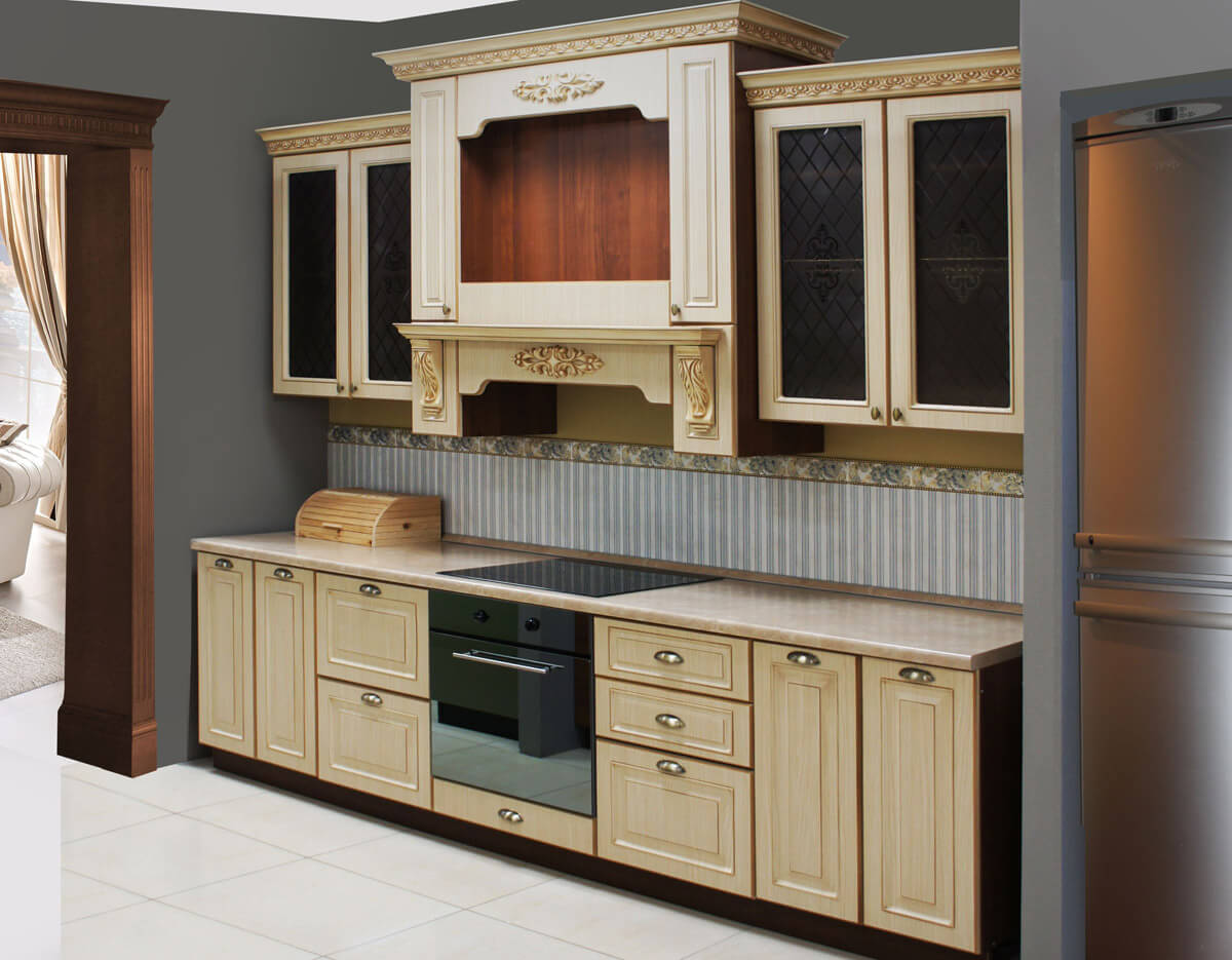 Фасад изготовлен из МДФ с использованием декора, отделан пленкой ПВХ с нанесением патины.