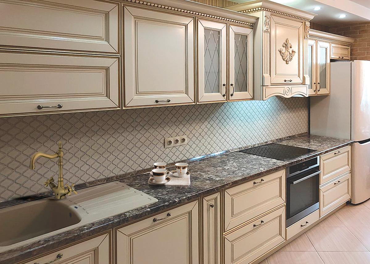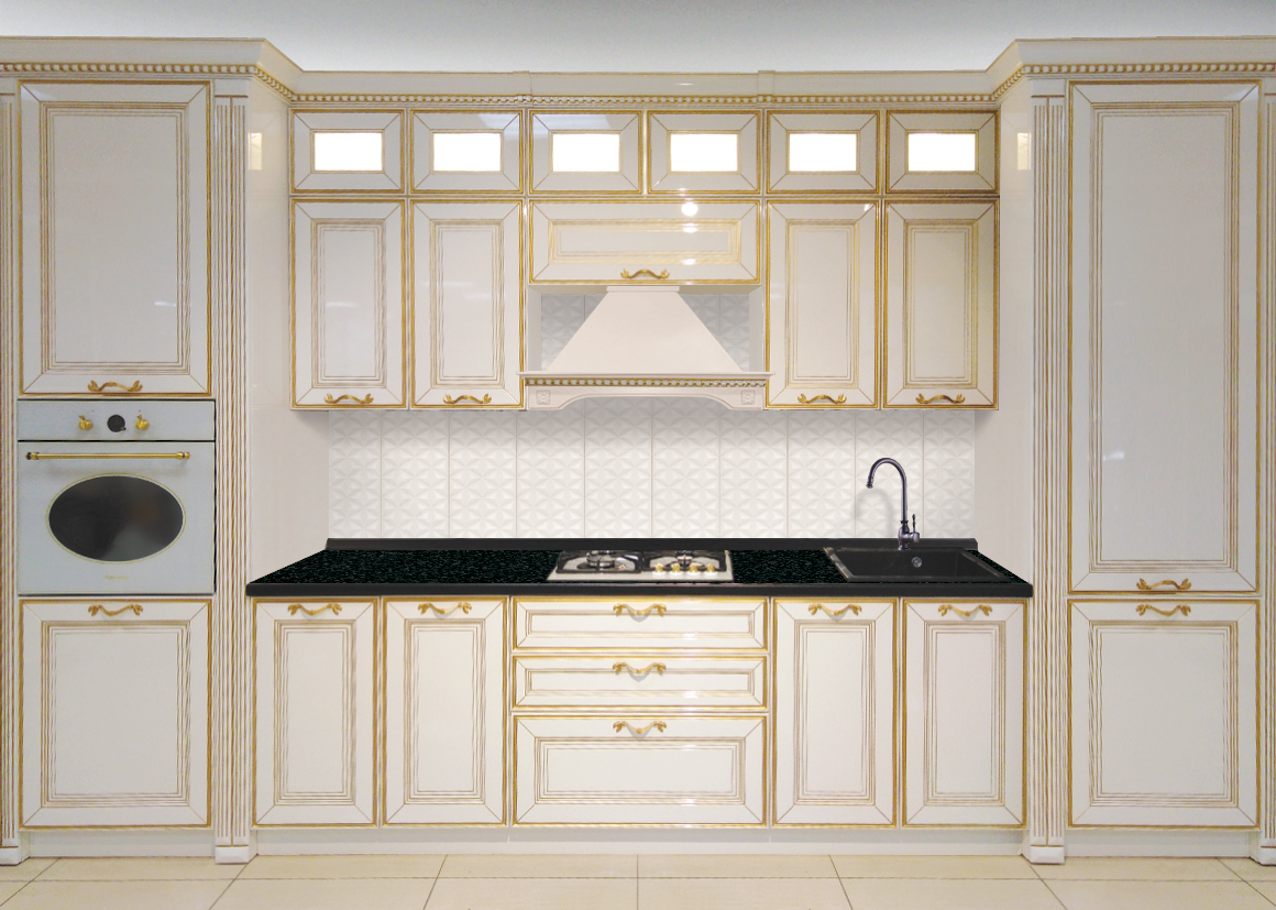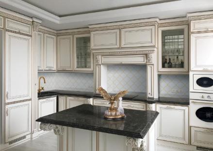Фасады этой модели из МДФ, имеют рамочную конструкцию с объемной, многослойной филенкой. Окрашивается эмалями с нанесением патины. Толщина фасада 22 мм.