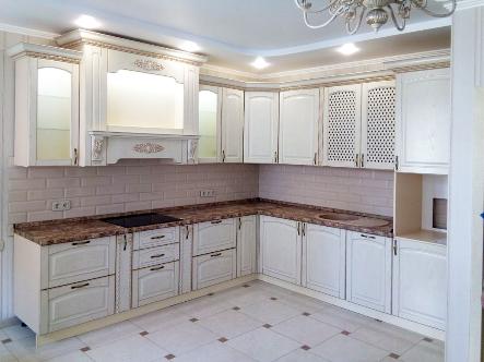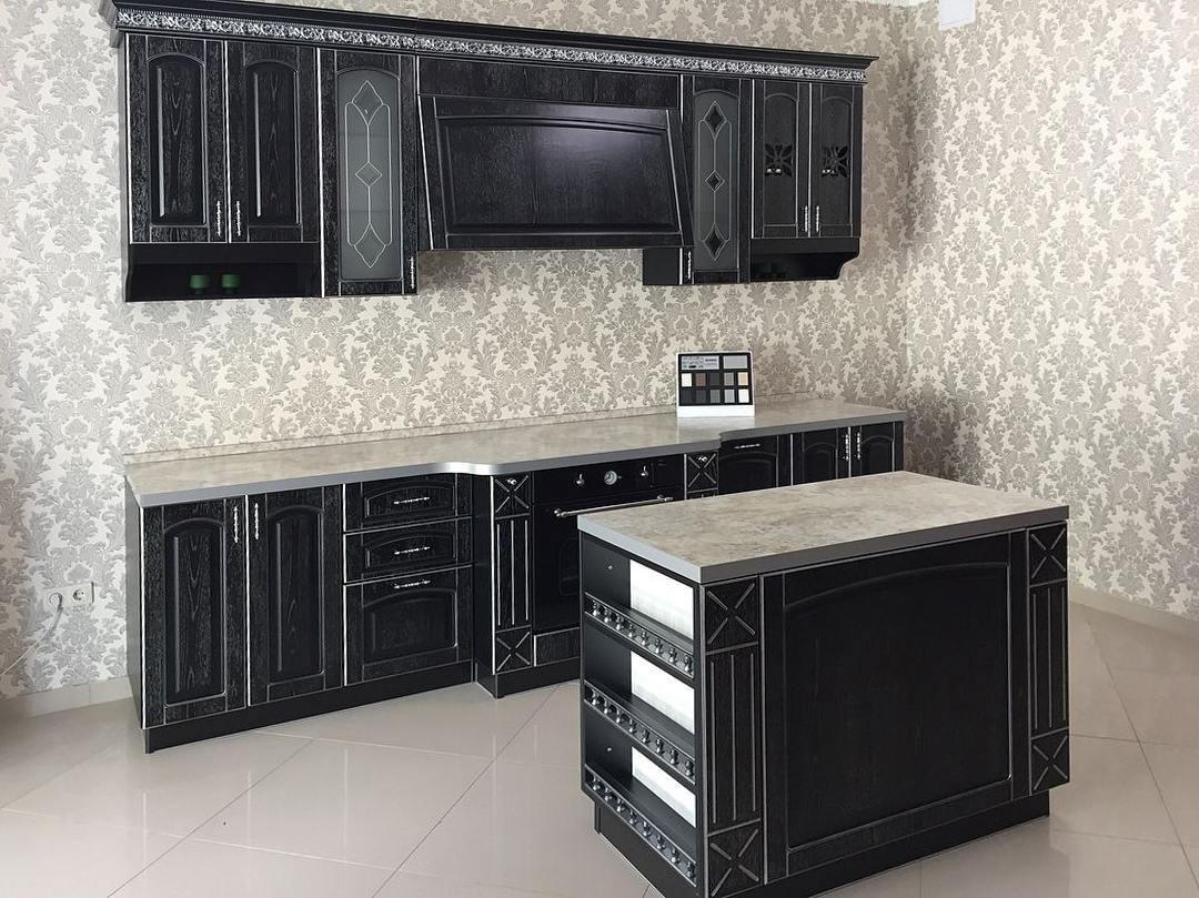 Фасады из МДФ + натуральный шпон дуба, лакокрасочное покрытие с эффектом патинирования. Возможен выкрас по каталогу цветов RAL