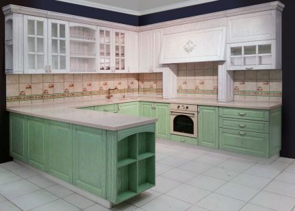 Фасады из МДФ + натуральный шпон дуба, лакокрасочное покрытие с эффектом патинирования. Возможен выкрас по каталогу цветов RAL