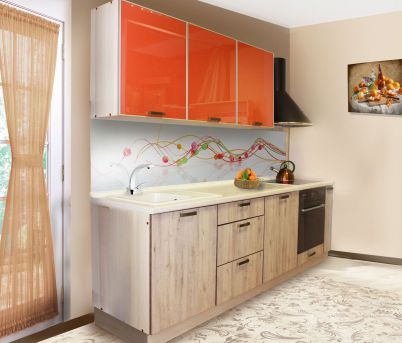 Это модель эконом-класса с фасадами из материалов производства компании «Русский ламинат», обработанных кромкой ПВХ. Поверхность фасадов имитирует поверхность, покрытую шпоном дерева. В дополнение к фасадам с деревянными текстурами рекомендуется использовать цветное стекло «Lacobel» в алюминиевом профиле
