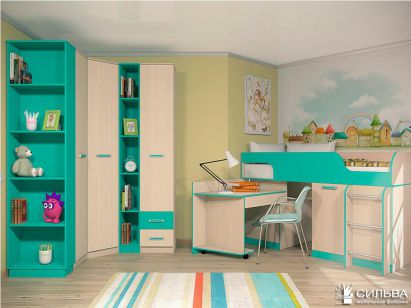 Детская Рико - это серия модульной детской мебели, в комбинации цветов корпус - дуб девонширский, комбинированные фасады - дуб девоширский + коралл или дуб девоширский + аква, дуб девонширский + ирис или зеленый(модерн), дуб девонширский + дуб тортона.