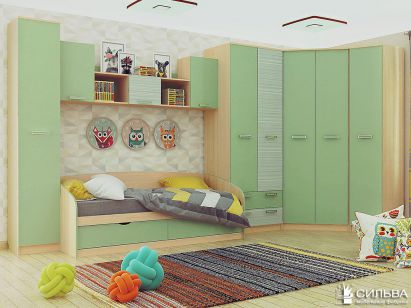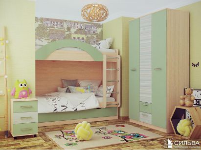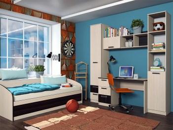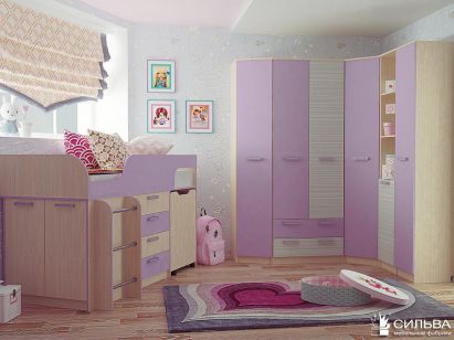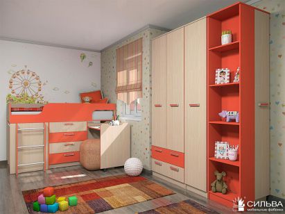 В составе детской Рико есть кровати, несколько универсальных кроватей-чердаков, шкафы для одежды и стеллажи, столы, комод, тумбы и другие необходимые элементы того, что бы детская была не только красива но и по максимому функциональна.