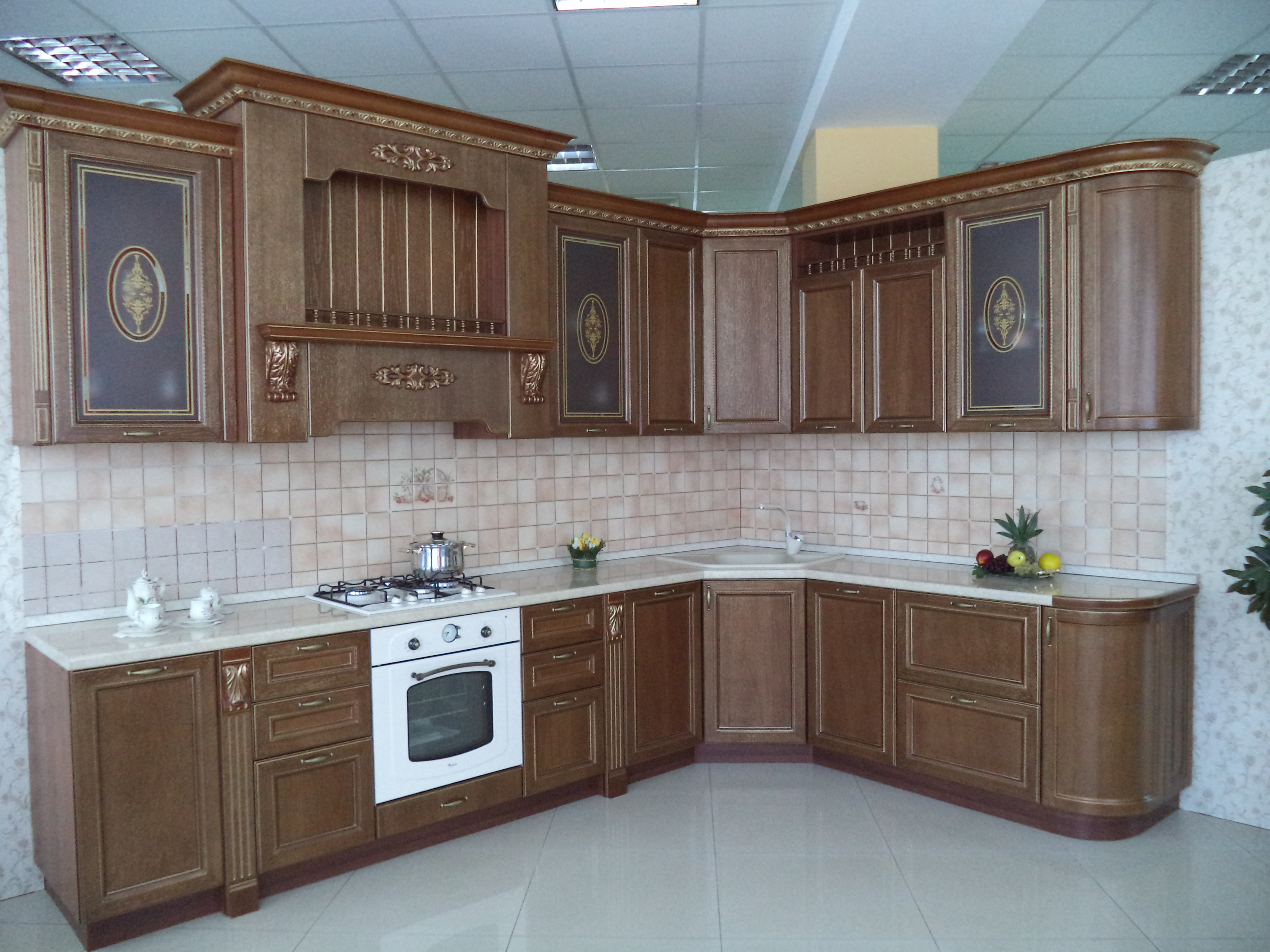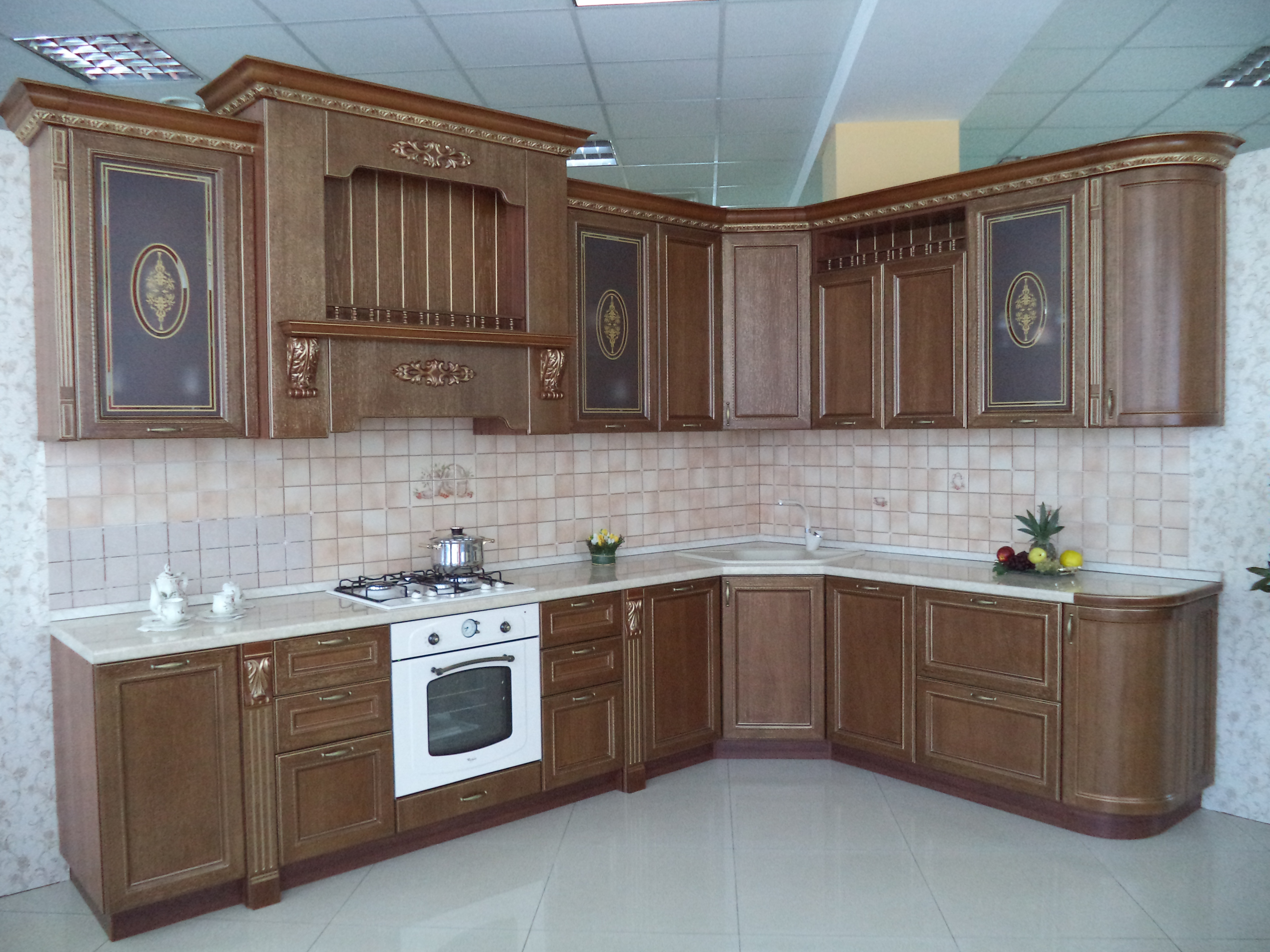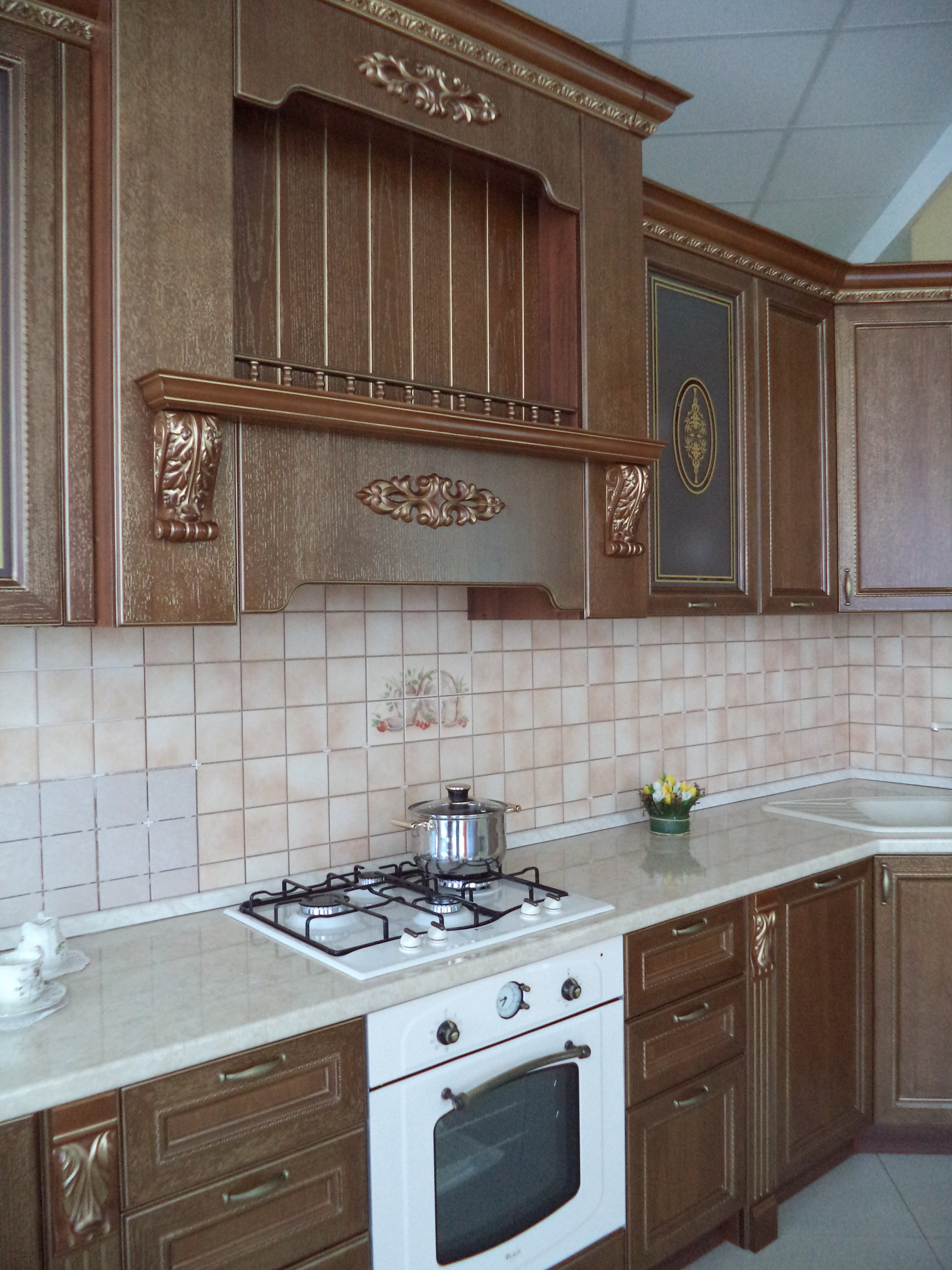 Фасад этой модели из МДФ рамочной конструкции с плоской филенкой, украшен линейным декором, облицован шпоном дуба. Толщина фасада 22 мм, Фасад может быть окрашен во все цвета эмалей согласно классификатору покрытий НКМ "Виктория", а также в цвета по каталогу RAL, с нанесением золотой или серебряной патины.