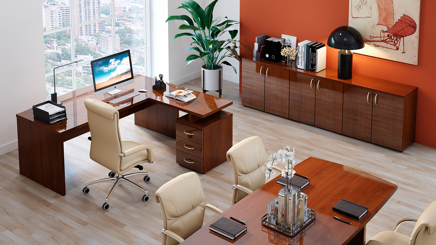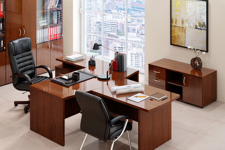 Кабинет Вегас от Шатура – это глянцевые поверхности в благородном оттенке текстуры Орех Ренуар, широкий ассортимент модельного ряда и высокое качество исполнения. Четыре слоя лака на фасадах опорах и столешницах создают прочную, устойчивую к истиранию высокоглянцевую поверхность. Столешницы и опоры столов толщиной 32 мм из сверхпрочного не пустотелого ДСП увеличивают и без того немалый срок эксплуатации. Функционал каждого элемента мебели детально продуман и воплощен в традиционном для Шатуры безупречном качестве.