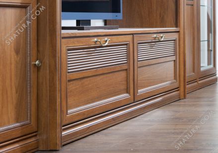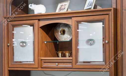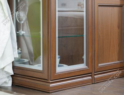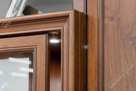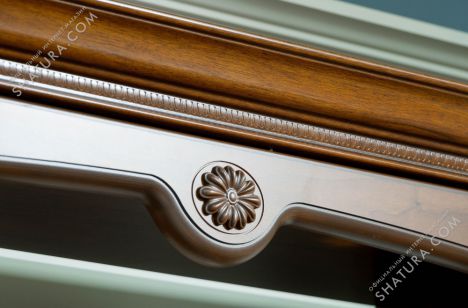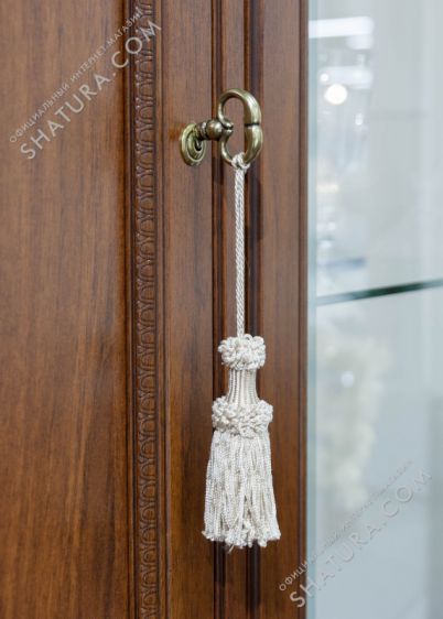 *Применяемая фурнитура в соответствии с последними техническими разработками мировых производителей мебельной фурнитуры. Это в первую очередь направляющие Quadro на всех ящиках шкафов, тумб и комодов и, конечно же, петли дверей Hettich. *Оригинальные решения в декоре стекол (паспарту и вензеля) в гостиных и декоративных накладках МДФ на фасадах шкафов в спальнях. Дополнительный шарм мебели придают кисточки на ручках-ключиках высоких щитовых дверей.