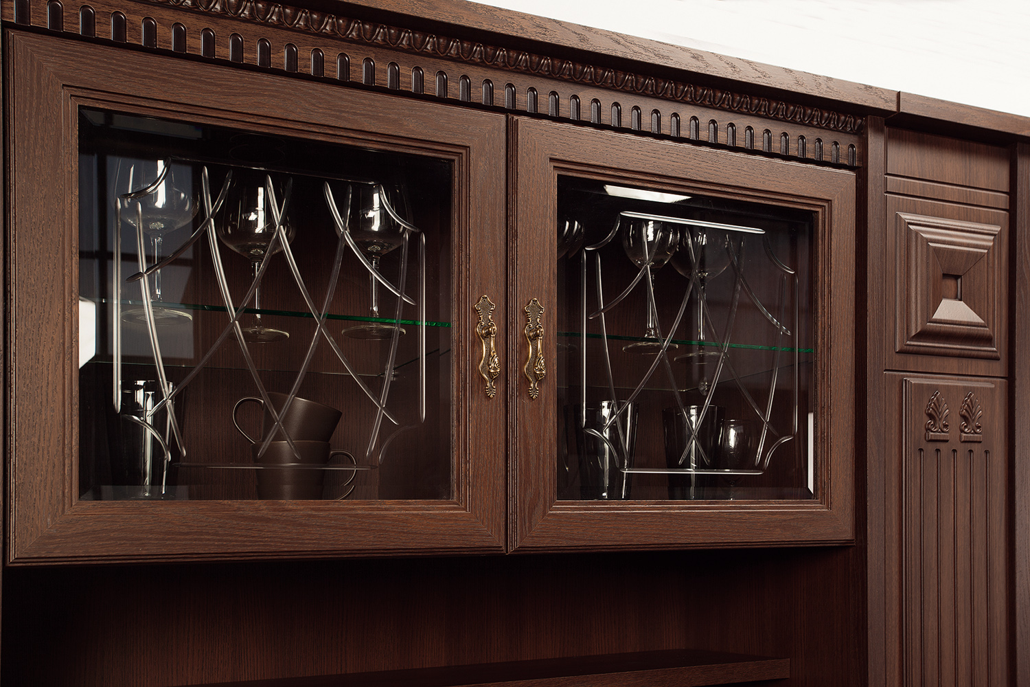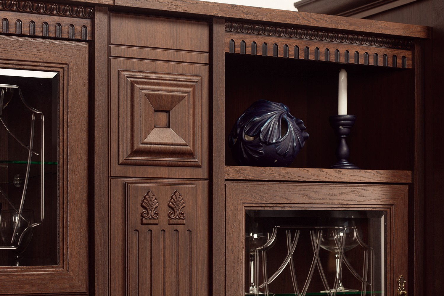 Запоминающийся облик коллекции «Лючия» обеспечивают оригинальные дизайнерские приёмы: торцевые и внутренние модули-колонны, сложная радиусная гравировка и фигурная фрезеровка в сочетании с объемными декоративными элементами. Мебель оснащена надежной немецкой фурнитурой «Hettich» и роскошными итальянскими ручками под состаренное золото и серебро, что является несомненным плюсом ко всем ее достоинствам.