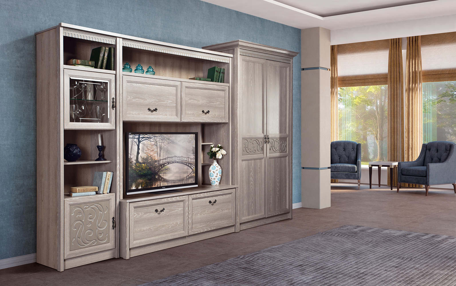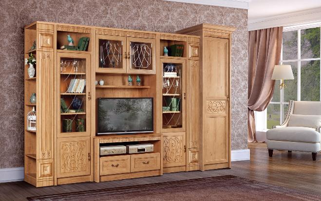 Классическая серия «Лючия» включает 12 модулей для гостиной и кабинета. Мебель представлена в 3-х декорах, реалистично имитирующих древесину натурального дуба: в темно коричневом «дубе оксфорд», янтарно-коричневом«дубе ридинг» и модном серо-бежевом «дубе оксфорд серый».