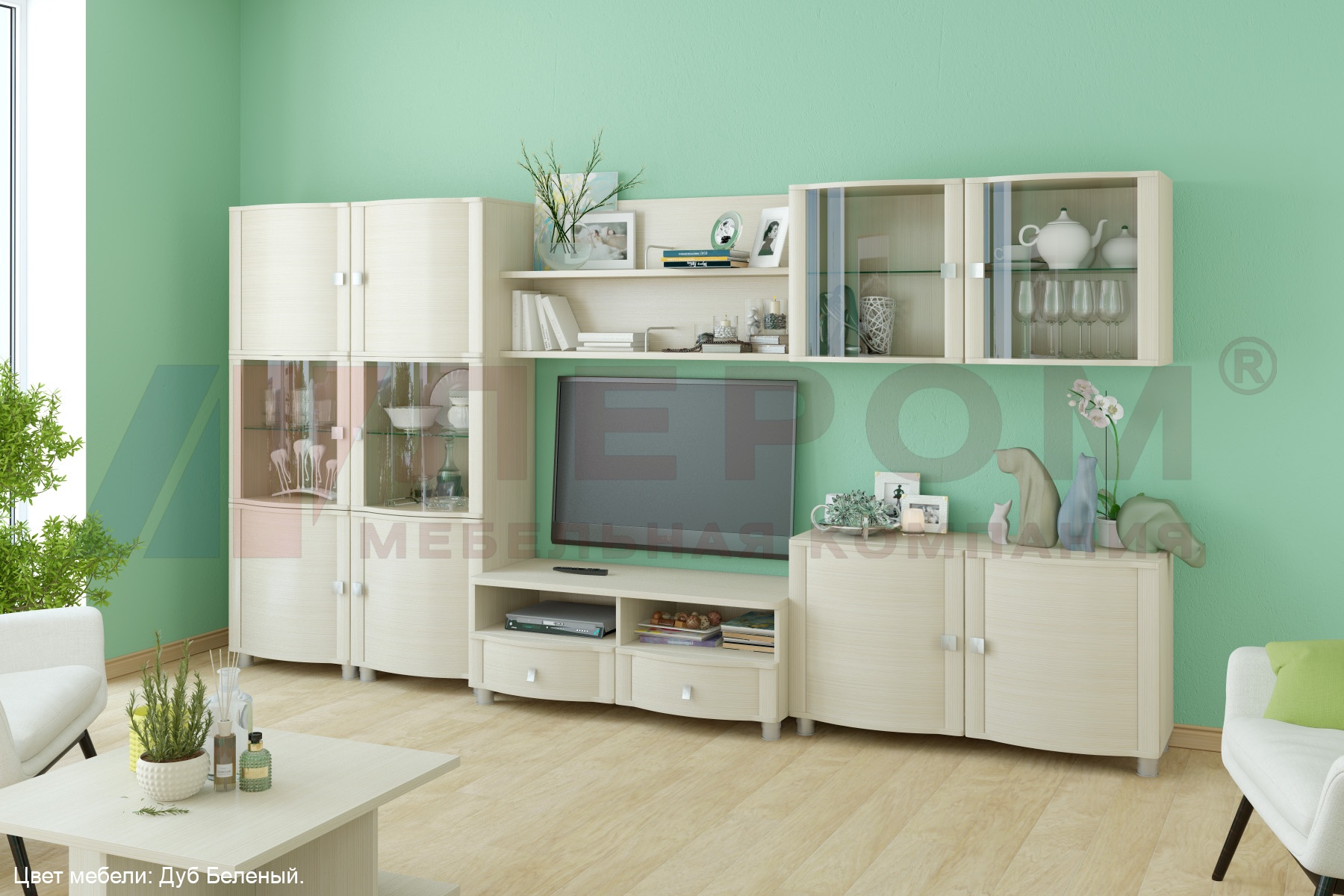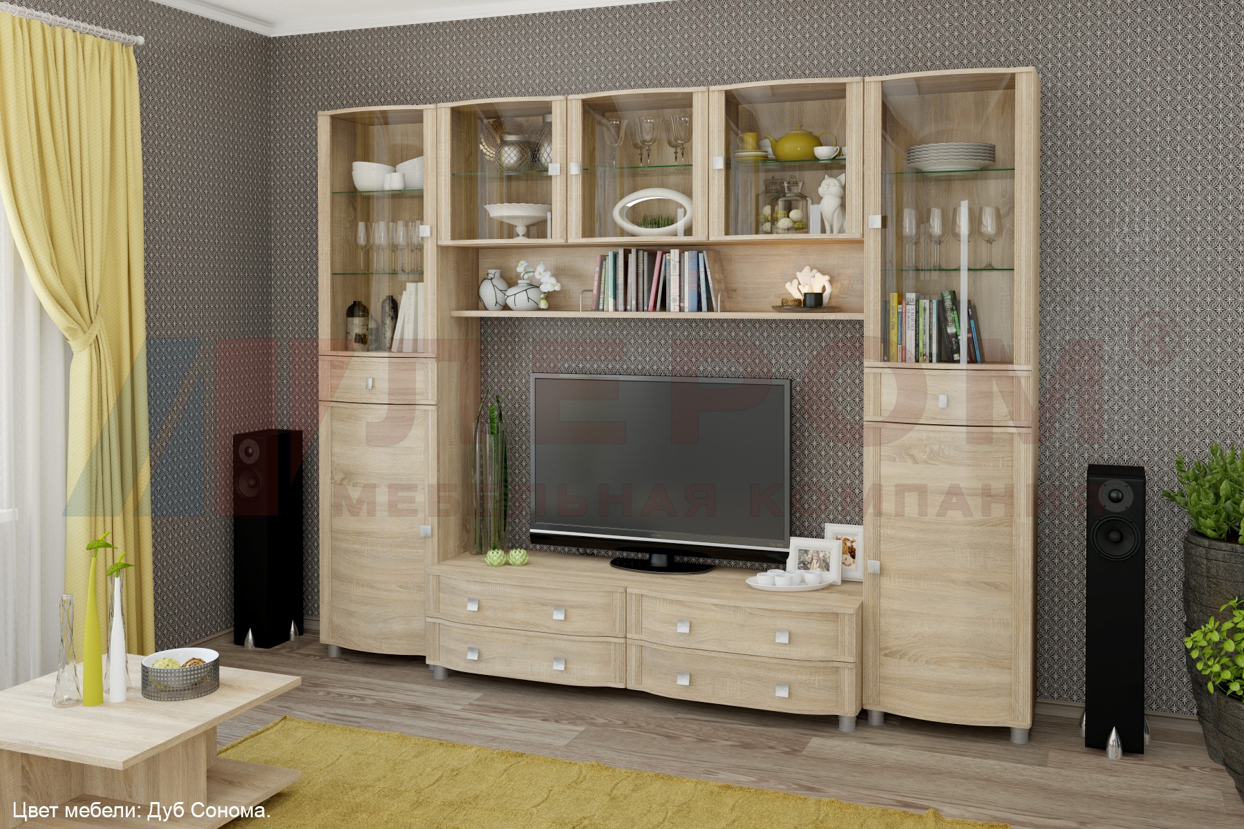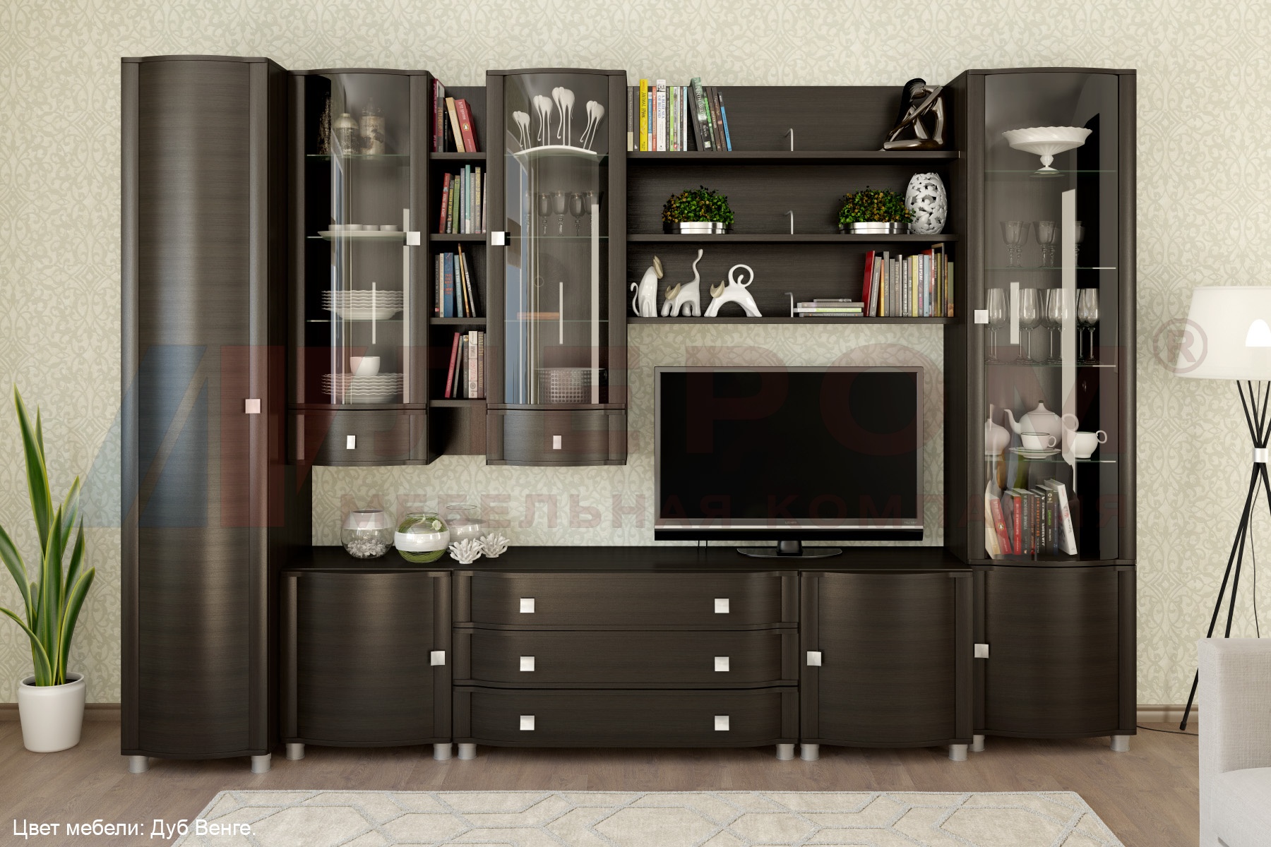 Корпусная мебель для гостиной "Оливия" - это модульная мебель. Она состоит из 55 модулей, с помощью которых можно составить огромное множество вариантов готовых композиций. Мебель изготавливается из высококачественных материалов: ЛДСП, МДФ (фасад), стекло фасадов с оттенком "бронза".
