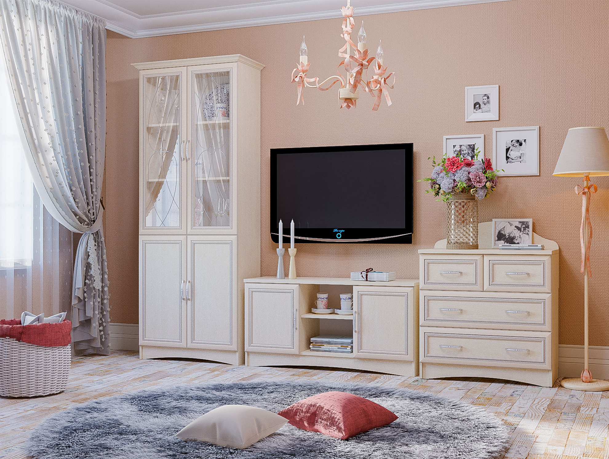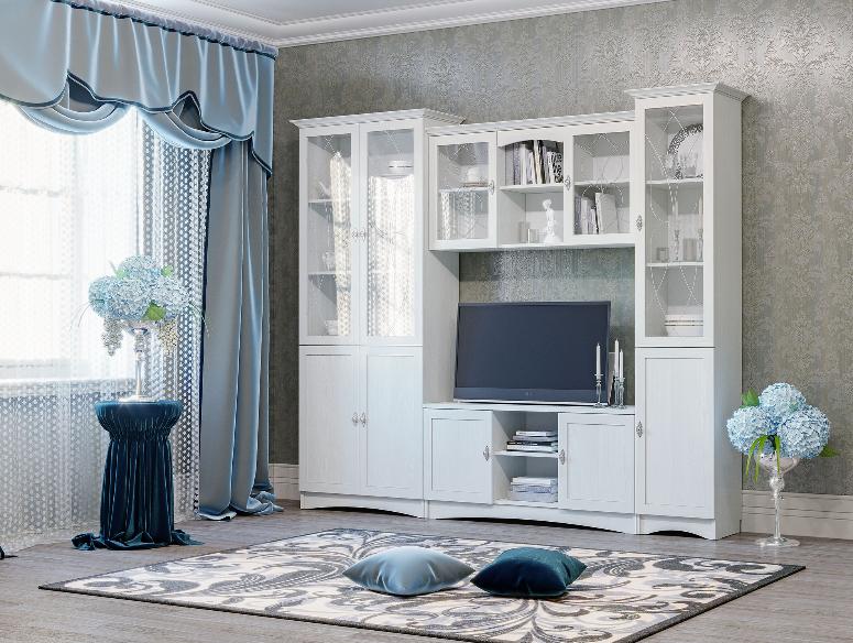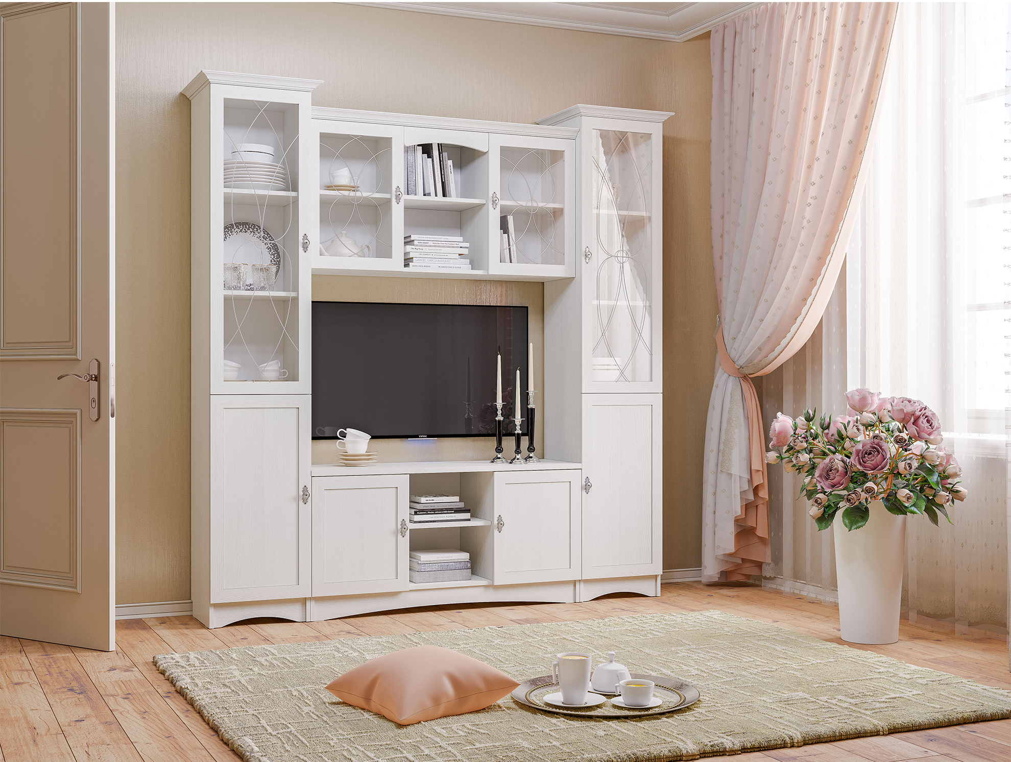 В гостиной Прованс представлены модули со стеклянными фасадами, витражный рисунок и классические карнизы, с их помощью вы создадите легкий и нежный интерьер воплощающий стиль французской провинции.