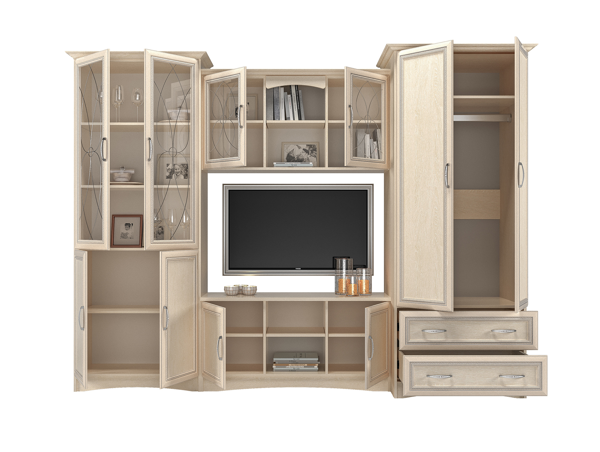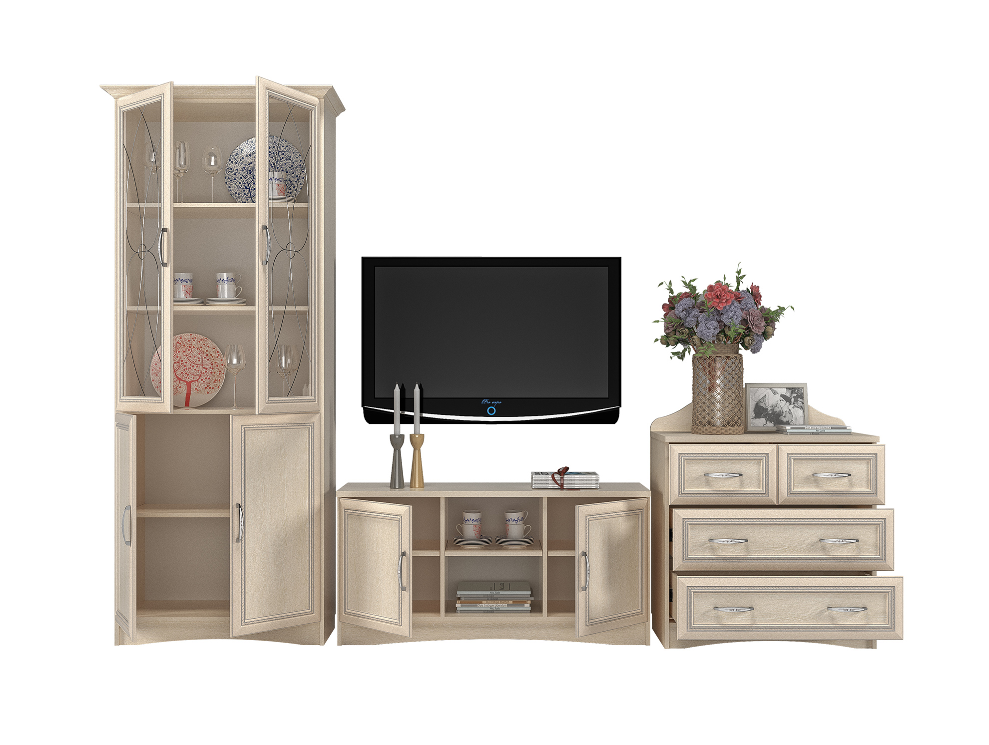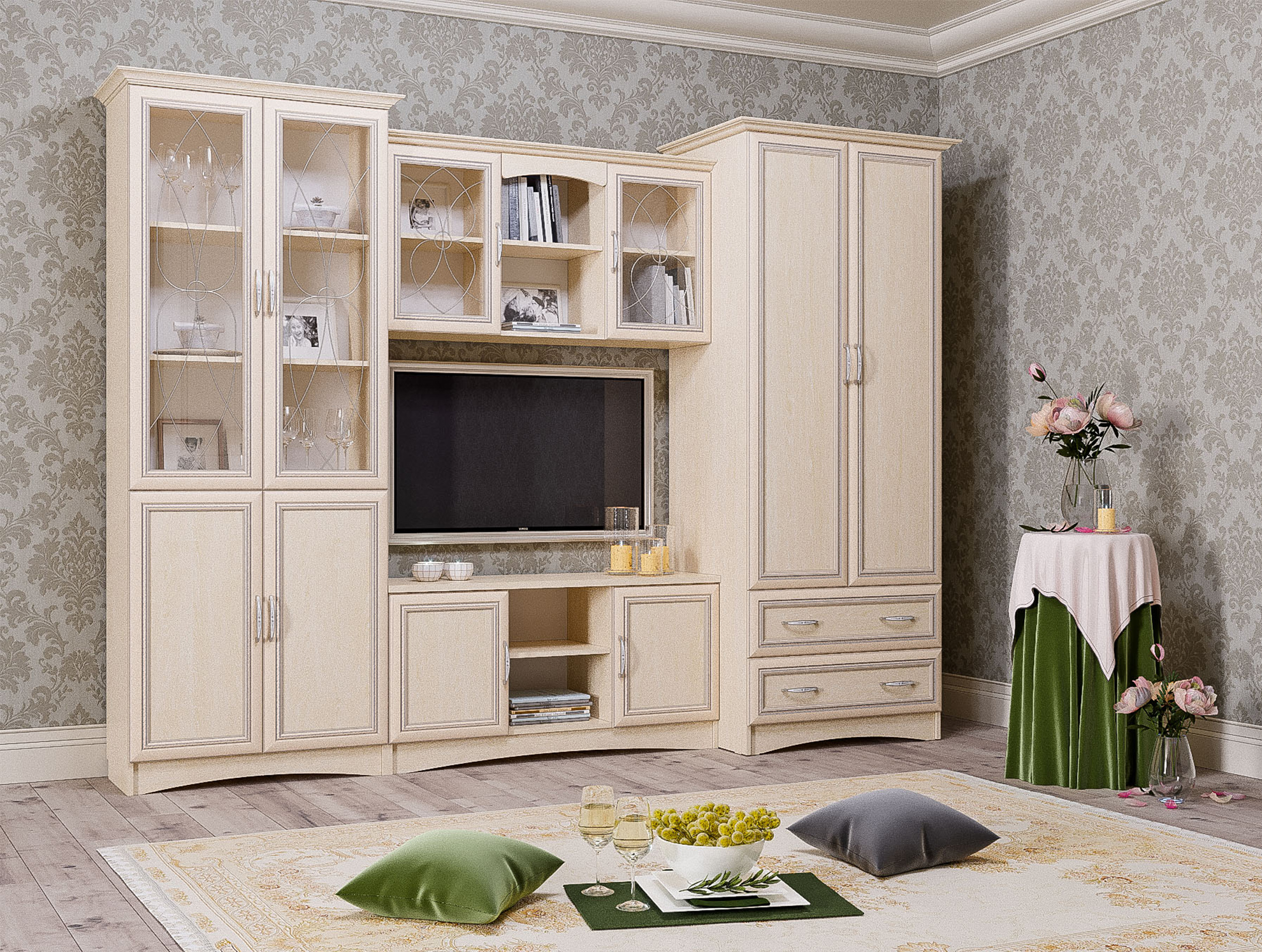 В гостиной Прованс представлены модули со стеклянными фасадами, витражный рисунок и классические карнизы, с их помощью вы создадите легкий и нежный интерьер воплощающий стиль французской провинции.
