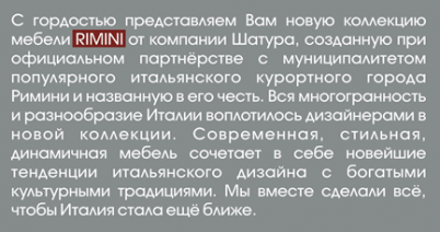 Все многообразие и многогранность Италии воплотилось итальянским дизайнером в разнообразии цветовых решений и изделий новой коллекции RIMINI. Наборы коллекции RIMINI сквозные, а значит покупатель может дополнить гостиную кроватью, или дополнить спальню изделиями из гостиной.