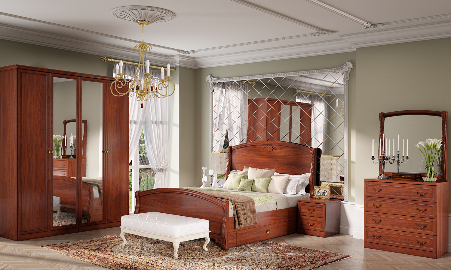 Спальня «Камелия Орех» — классический мебельный гарнитур, помогающий создать уютную обстановку. В ее оформлении используется оригинальная текстура «Ноче Ренуар» от Schattdecor, которая точно повторяет оттенок и естественный рельефный рисунок древесины ореха. Украшением мебели служат декоративные профили и фурнитура цвета антикварной бронзы. Качественные материалы позволяют добиться ощущения солидности и даже некоторой аристократичности. Коллекция продолжает традиции европейских мастеров — она создана в сотрудничестве с итальянскими дизайнерами. При ее производстве используется европейская фурнитура, рассчитанная на долгие годы безупречной службы.
