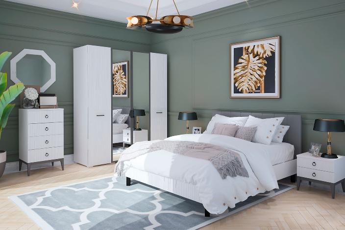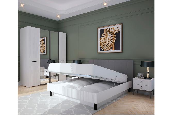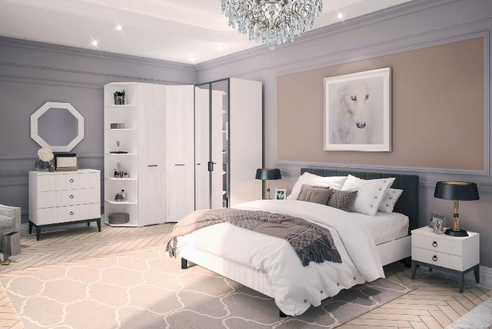 Модульная коллекция мебели для спальни "Хилтон" выполнена в современном стиле. Предполагает большую вариативность по размерам и функционалу в создании композиции. Строгость линий и геометрически правильных форм поддержаны контрастным цветовым решением: чистый белый цвет каркаса и фасадов в сочетании с черной матовой фурнитурой и темно-серыми рамками фасадов с зеркалами и деревянных опор.