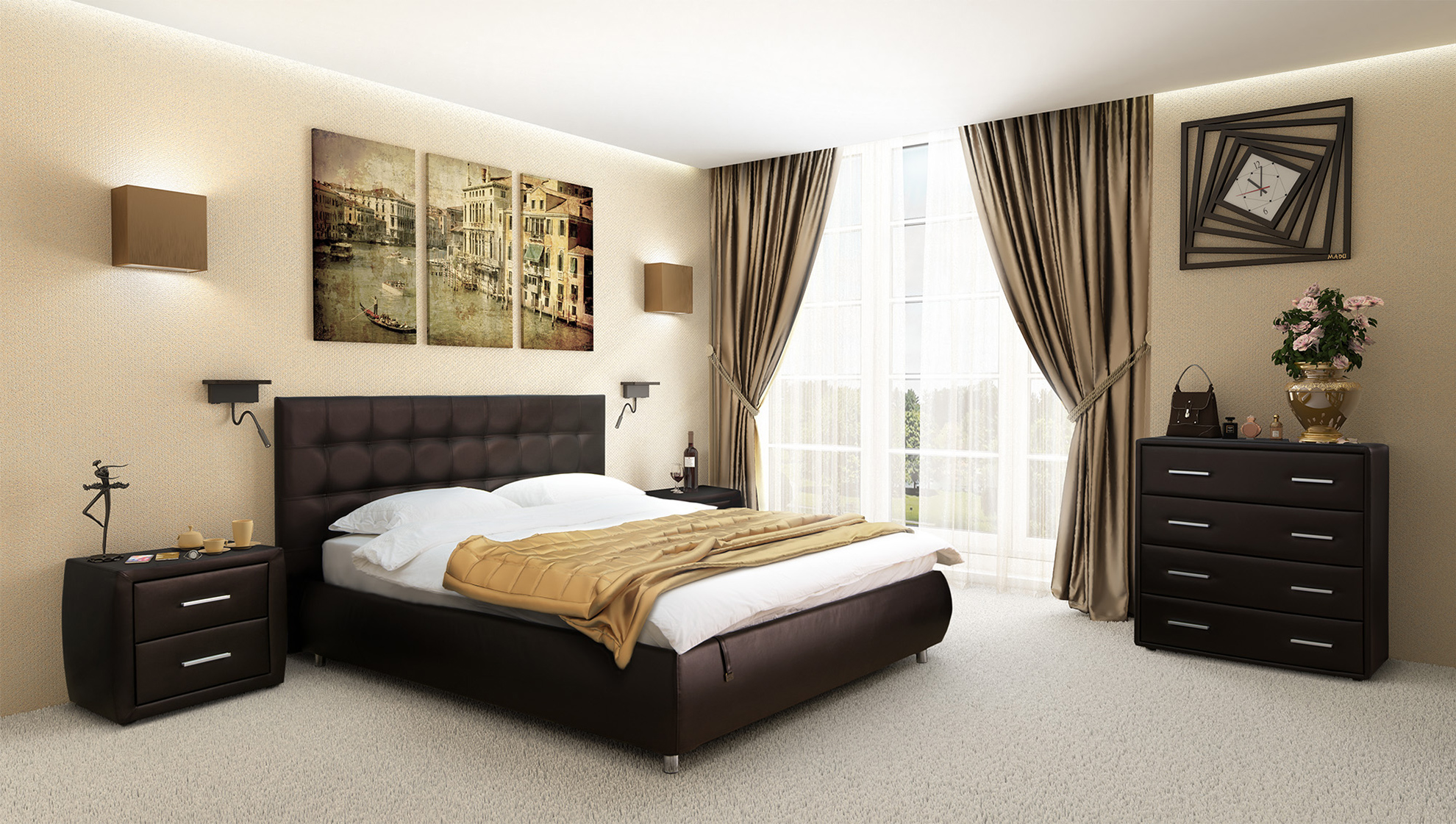 К кровати можно подобрать тумбы и комод выполненные в одном стиле.